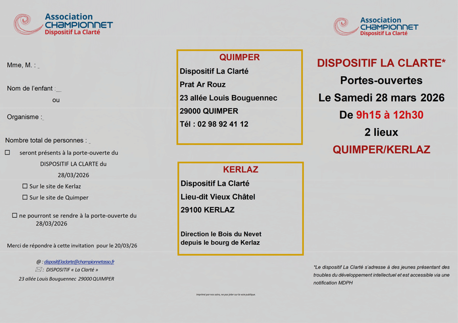 Les portes ouvertes du Dispositif La Clarté dans le Finistère auront lieu le Samedi 28 Mars 2026 de 9h15 à 12h30.